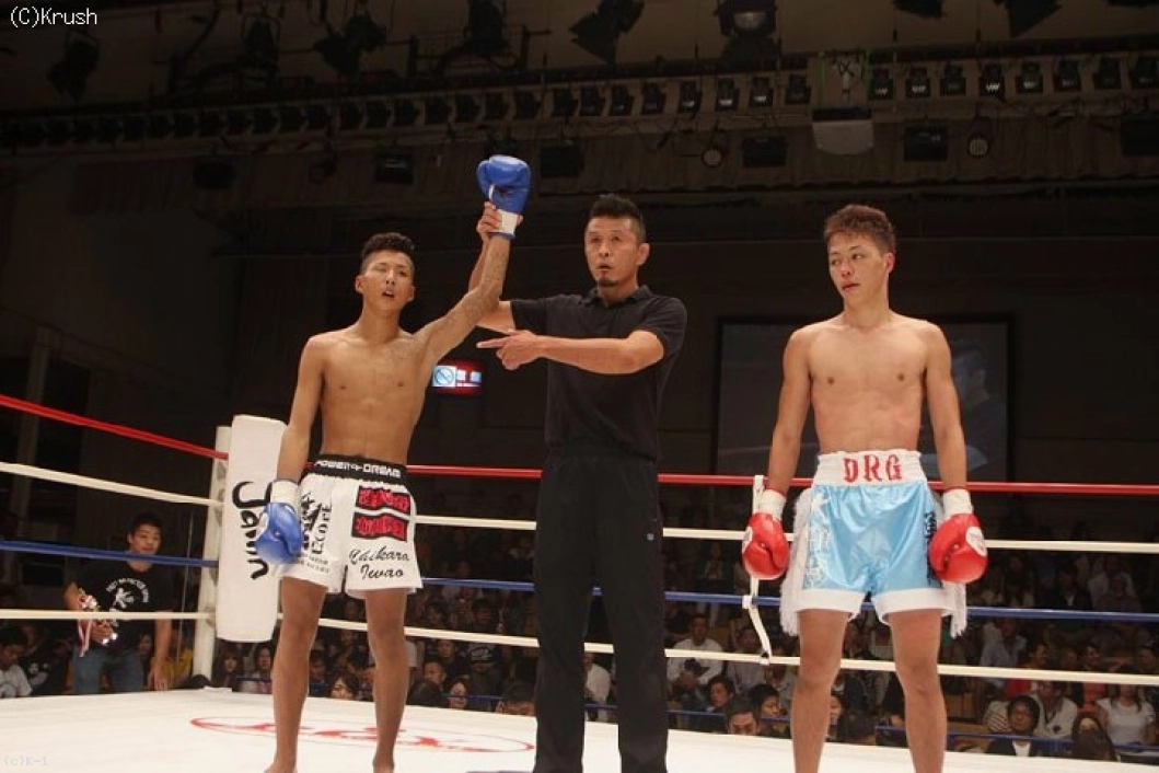 3R、亀本がワンツー、岩尾もボディブローを返す。距離を詰めて前に出る亀本に対し、岩尾はパンチと右ハイキック。前に出る亀本がヒザ蹴りと左ストレート。岩尾も右ミドルとヒザ蹴りを返す。残り30秒、パンチと蹴りで両者が打ち合い、試合終了のゴング。1Rにダウンを奪った岩井が判定勝利した。