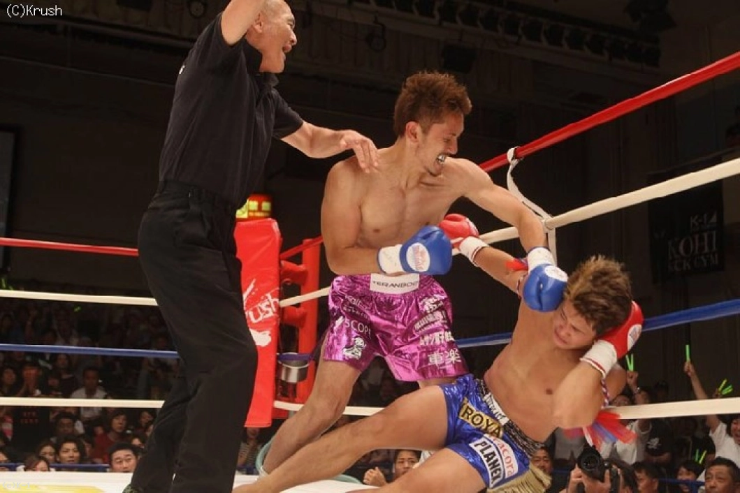 1R開始直後、寺崎が右フックを強振。これでHIROYAをぐらつかせると、HIROYAをコーナーに詰めて一気にパンチを連打する。何とかパンチとヒザ蹴りを返すHIROYAだったが、寺崎が右ストレートを打ち抜いてダウンを奪う。立ち上がったHIROYAに寺崎は猛攻。再び右ストレートからの連打でダウンを奪うと、レフェリーが試合をストップ。寺崎が下馬評を覆すKO勝利でKrushのベルトを腰に巻いた。