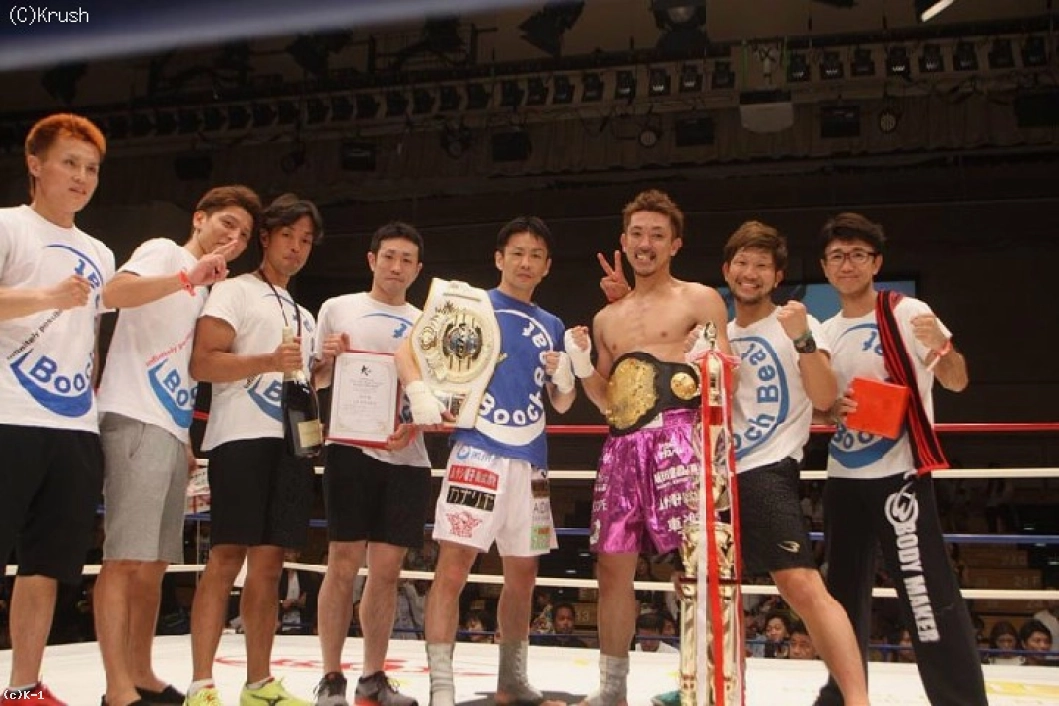 試合後、「正直ビビっていて、今日チャンピオンになれなかったら、辞めようと思っていました。でもたくさんの人に応援されてチャンピオンにならないと辞められないと思いました」と語った寺崎。WILDRUSHリーグで戦った仲間たちに「あの時、倒してくれてありがとう。あれがなかったら自分はここまで来れなかった」とメッセージを送ると、Krush-65kg級で戦っているNOMAN、塚越仁志、TaCaに対して「みんなでベルトをかけて戦えたらいいなと思います。だから挑戦してきてもいいよ」と笑ってみせる。