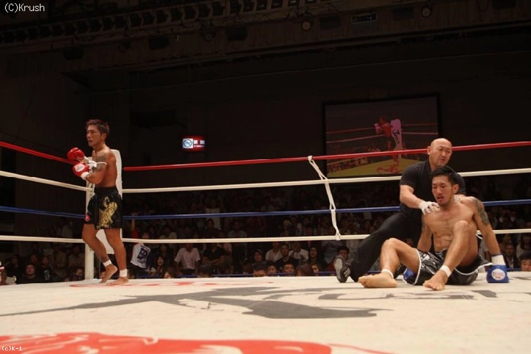 2R、左のヒザ蹴りで突進する小鉄。中澤はそこにパンチを合わせて強烈なロー、左フックでダウンを奪う。何とか立ち上がる小鉄だったが、中澤は落ち着いてローとパンチを散らし、最後はワンツーを叩き込んで小鉄をなぎ倒した。