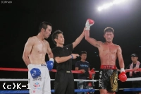 3Rもローを蹴り続ける牧平。下がる冨樫だったが必死に立ち続け、ローにパンチを狙う。牧平はローと飛びヒザ蹴りで最後まで攻め続けたが、冨樫を仕留めきれず。牧平の判定勝利に終わった。