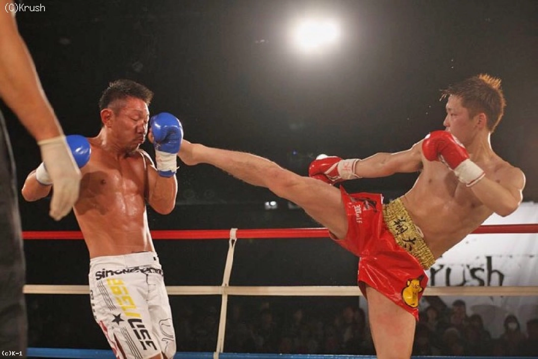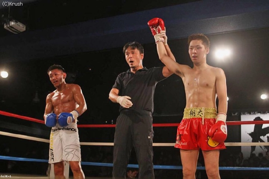 3Rに入っても手数が減らない水嶋。翔太はパンチから奥足ローにつなげると、ついに水嶋がバランスを崩す。必死に奥足ローを蹴る翔太。水嶋も踏ん張って左ストレートと右フックで前に出る。1Rにダウンを奪い、ローを効かせた翔太が判定勝利を収めた。
