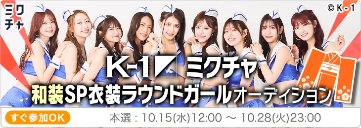 K-1実行委員会からの新たなお知らせです。 K-1と株式会社DONUTS(東京都渋谷区、代表取締役:西村啓成)が運営するライブ配信&動画アプリ「ミクチャ」( https://mixch.tv/ )が、2025年11月15日(土)に東京・国立代々木競技場第一体育館で開催される「K-1 WORLD MAX 2025」のラウンドガール出演者を決定するオーディションイベント『K-1×ミクチャ和装SP衣装ラウンドガールオーディション』を、10月15日 (水) 12:00 ~ 10月28日 (火) 23:00まで開催いたします。 本オーディションは、書類審査および「ミクチャ」審査にて入賞者2名を選出し、2025年11月15日(土)に開催される「K-1 WORLD MAX 2025」にラウンドガールとして登場してもらいます。また、当日放映される会場ビジョンにて紹介、大会前日に実施を予定しているラウンドガール発表の記者会見に登壇いただくなど、試合中のラウンドガールだけでなく様々な形で活躍いただく機会を用意しております。 激しい闘いの雰囲気を一瞬で華やかに彩るラウンドガールが決まる本オーディションイベントに、ぜひご注目ください。 『K-1×ミクチャ和装SP衣装ラウンドガールオーディション』の概要は、以下の通りです。 ■本選考期間 10月15日 (水) 12:00 ~ 10月28日 (火) 23:00 ■応募条件 ・2025年10月1日時点で身長150cm以上の16歳~39歳までの健康なお顔出し可能な女性限定です。 ・2025年11月14日(金)開催の前日記者会見への出席、11月15日(土)開催の「K-1 WORLD MAX 2025」への出演が可能かを事前に確認の上、応募をお願いします。 ・ご本人様または担当マネージャー様には事前エントリーフォームを提出頂き、書類審査合格者のみ本選参加ができます。 ・事務所所属の有無は問いません。競合排他のため、現在ラウンドガールとして活動されている方はご参加をご遠慮ください。 ・反社会的勢力と関わりのある方、タトゥーが入っている方、犯罪歴がある方などは応募された場合でも参加ができませんのでご了承ください。 ・本イベントはソロアカウントのみ参加することができます。 ・芸能事務所、モデル事務所、ライバー事務所に所属している方は必ず許諾を得てご応募ください。 ・参加に対する交通費・宿泊費・出演費の支給はございません。 ・当日撮影した画像、活動の様子はSNS・Webサイト・その他各種広告へ二次利用させていただく場合がございます。 ・いかなる理由でも履行日にお越し頂けない場合は補填対応などは行えませんのでご了承ください。 ・天災や諸事情により大会自体が中止となった場合は入賞者と相談の上、履行内容が一部変更になる場合がございます。 ・参加条件に適してないと判断された場合は入賞者都合により辞退扱いとなる場合がございます。辞退となった場合でも返金対応、補填対応などは出来かねますのでご注意ください。 ■応募窓口 https://line.me/R/ti/p/@574eemlc?ts=10102042&oat_content=url ■出演枠 ・2名 ■主なプライズ(賞品) ・「K-1 WORLD MAX 2025」でのラウンドガール出演 ・「K-1 WORLD MAX 2025」会場内ビジョン紹介 ※その他プライズに関する情報やオーディションイベントに関する詳細は、イベントページ(https://mixch.tv/p/nqa2bova )をご覧ください。 --------------- ■ライブ配信&動画アプリ「ミクチャ」について ライブ配信と動画投稿でコミュニケーションを楽しめるアプリ。2013年12月より運用を開始し、国内累計1,800万ユーザーを突破。現在の月間訪問者数は500人を超えています。2020年7月にサービス名を「MixChannel」より「ミクチャ」に改称いたしました。 公式サイト :http://mixch.tv (PC、スマートフォン共通) アプリダウンロードURL :https://app.adjust.com/5ns21yf ■株式会社DONUTSについて 社名 : 株式会社DONUTS 所在地 : 東京都渋谷区代々木2-2-1 小田急サザンタワー8階 代表者 : 代表取締役 西村啓成 設立 : 2007年2月5日 事業内容 : クラウドサービス事業、ゲーム事業、動画・ライブ配信事業、医療事業、出版メディア事業 企業サイト : https://www.donuts.ne.jp/ 採用情報 : https://www.wantedly.com/companies/donuts2007/