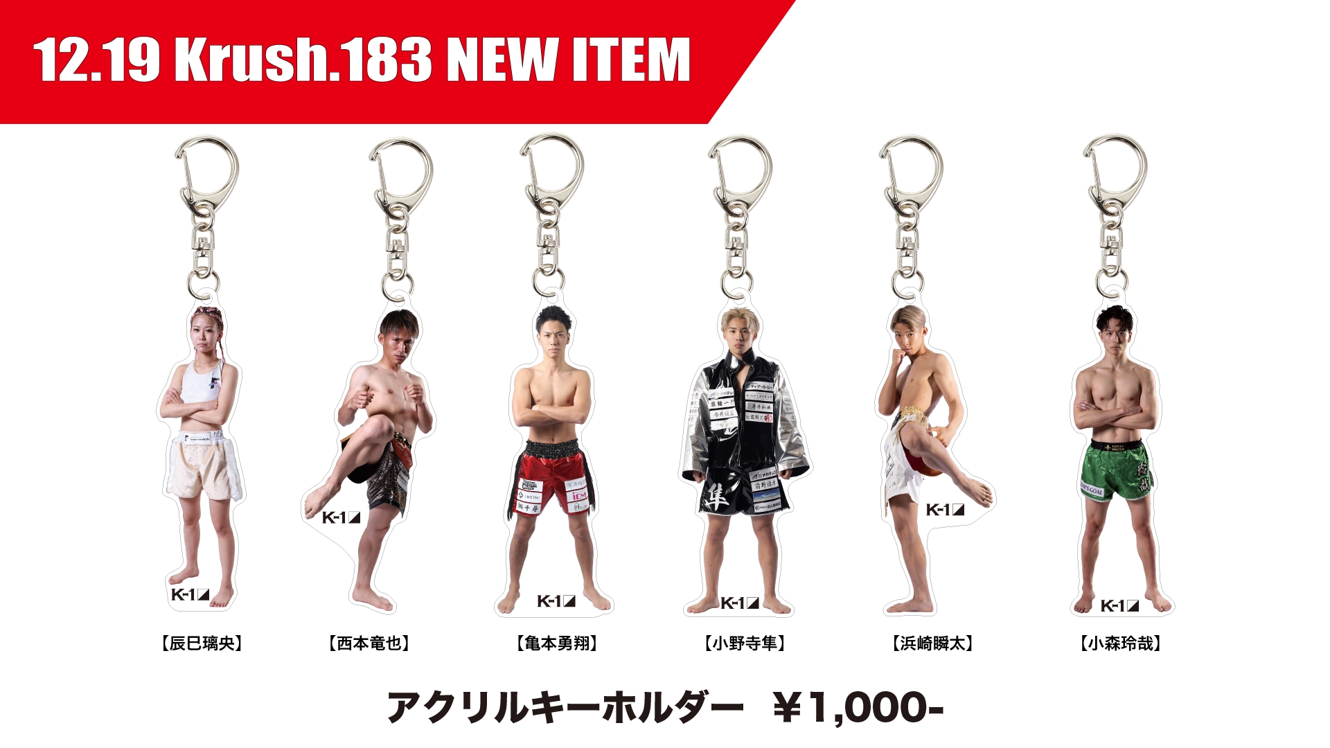 【新アクリルキーホルダー発売】「Krush.183」12.19(金)後楽園ホール大会 グッズ会場販売情報 2025.11.23 2025.12.10 来る、12月19日(金)「Krush.183」 後楽園ホール大会にて、新たに販売するグッズ情報をお知らせします。ぜひ会場物販コーナーにお立ち寄りください。<商品詳細>・【辰巳璃央】アクリルキーホルダー・【浜崎瞬太】アクリルキーホルダー・【小野寺隼】アクリルキーホルダー・【西本竜也】アクリルキーホルダー・【亀本勇翔】アクリルキーホルダー・【小森玲哉】アクリルキーホルダー販売価格:各1,000円(税込)