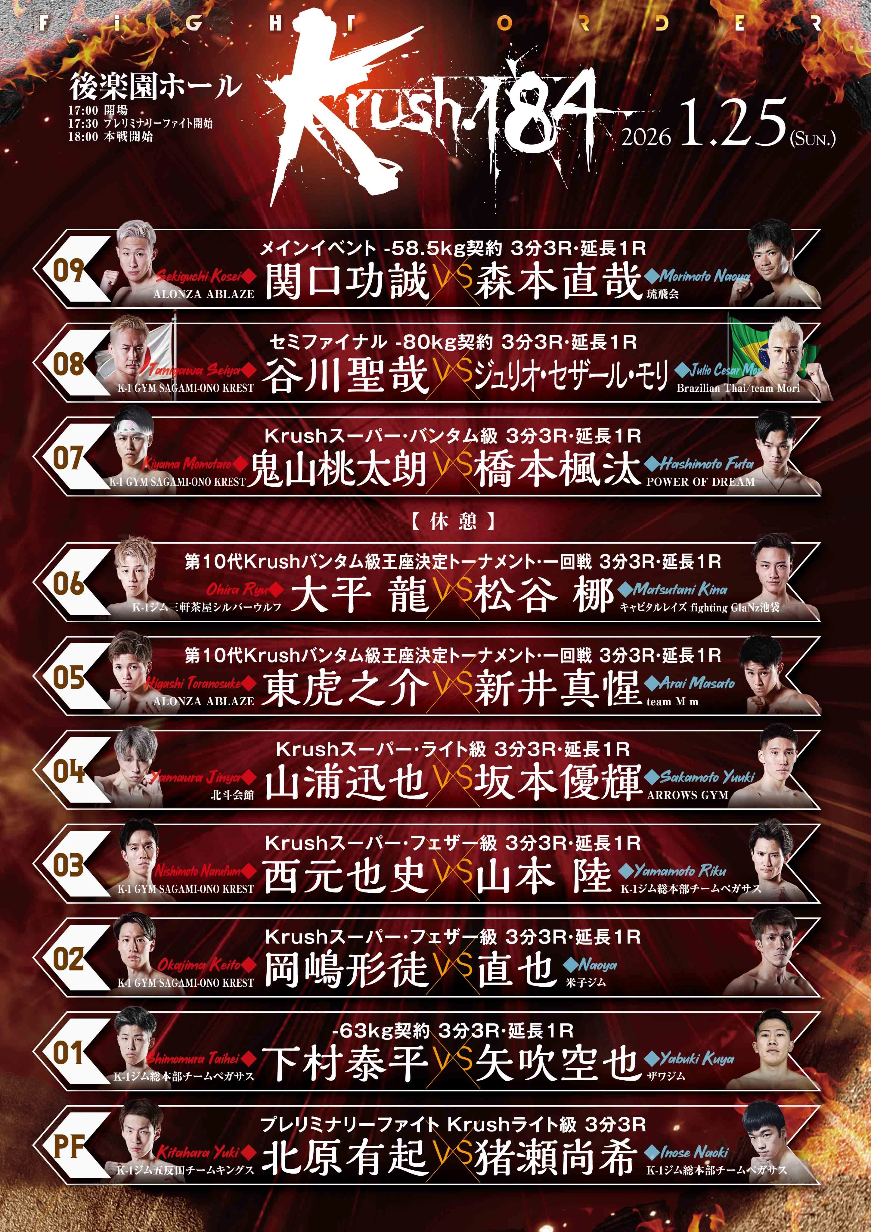 「Krush.184」1.25(日)後楽園ホール大会、全10カードの試合順が決定しました。