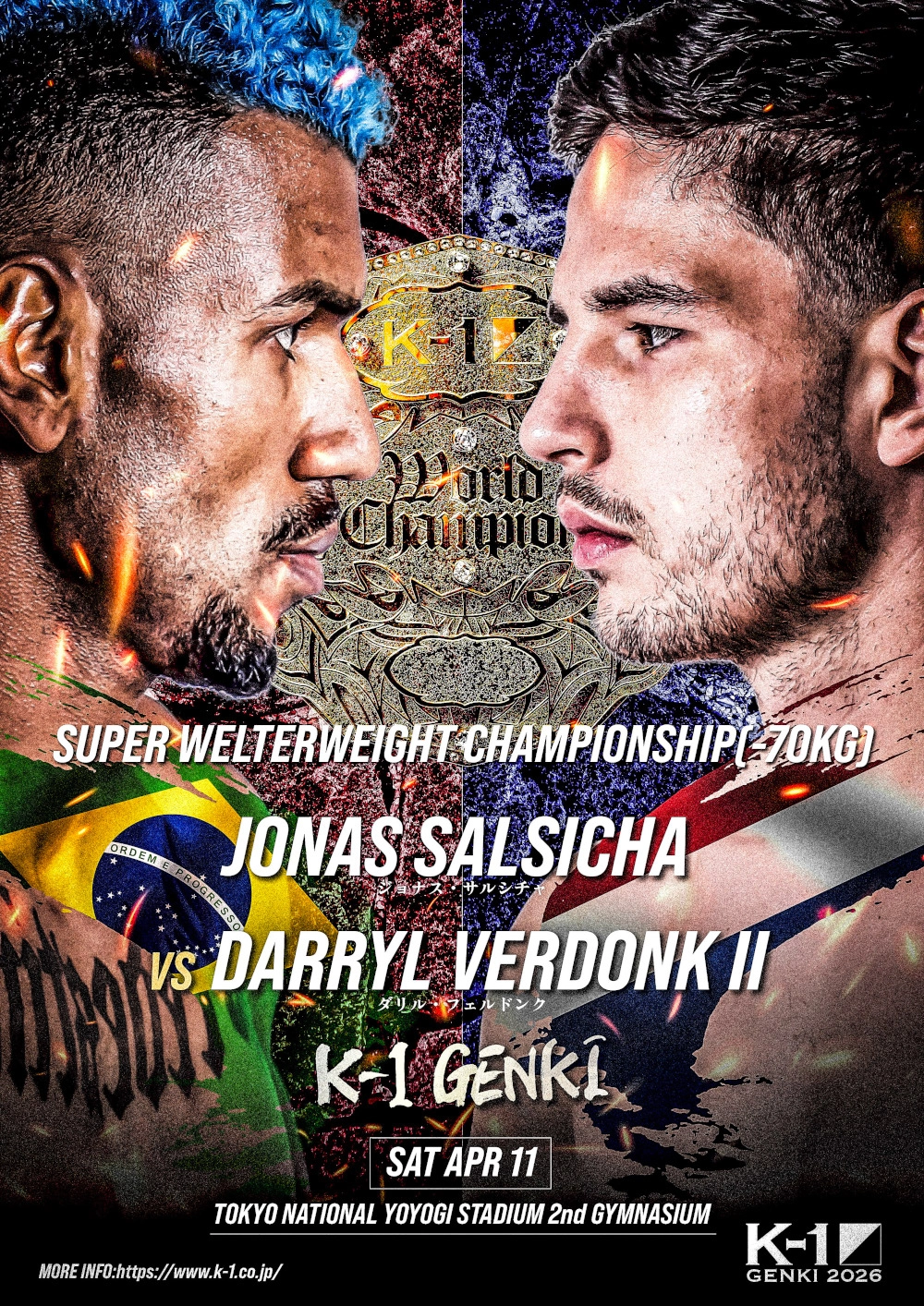 [第6代K-1 WORLD GPスーパー・ウェルター級王座決定戦/3分3R・延長1R] ジョナス・サルシチャ(ブラジル/TF Team/CT Allan Popeye) Jonas Salsicha 94.5.25生/ブラジル・サンパウロ出身/31歳/191cm/オーソドックス/31戦27勝(10KO)4敗 <主なタイトル歴> K-1 WORLD MAX 2025 -70kg世界最強決定トーナメント優勝 K-1 WORLD MAX 2025 -70kg南米予選トーナメント優勝 元WGP Kickboxingスーパーミドル級(-78.1kg)王者 X:@Jonassalsa1 instagram:@jonassalsicha1