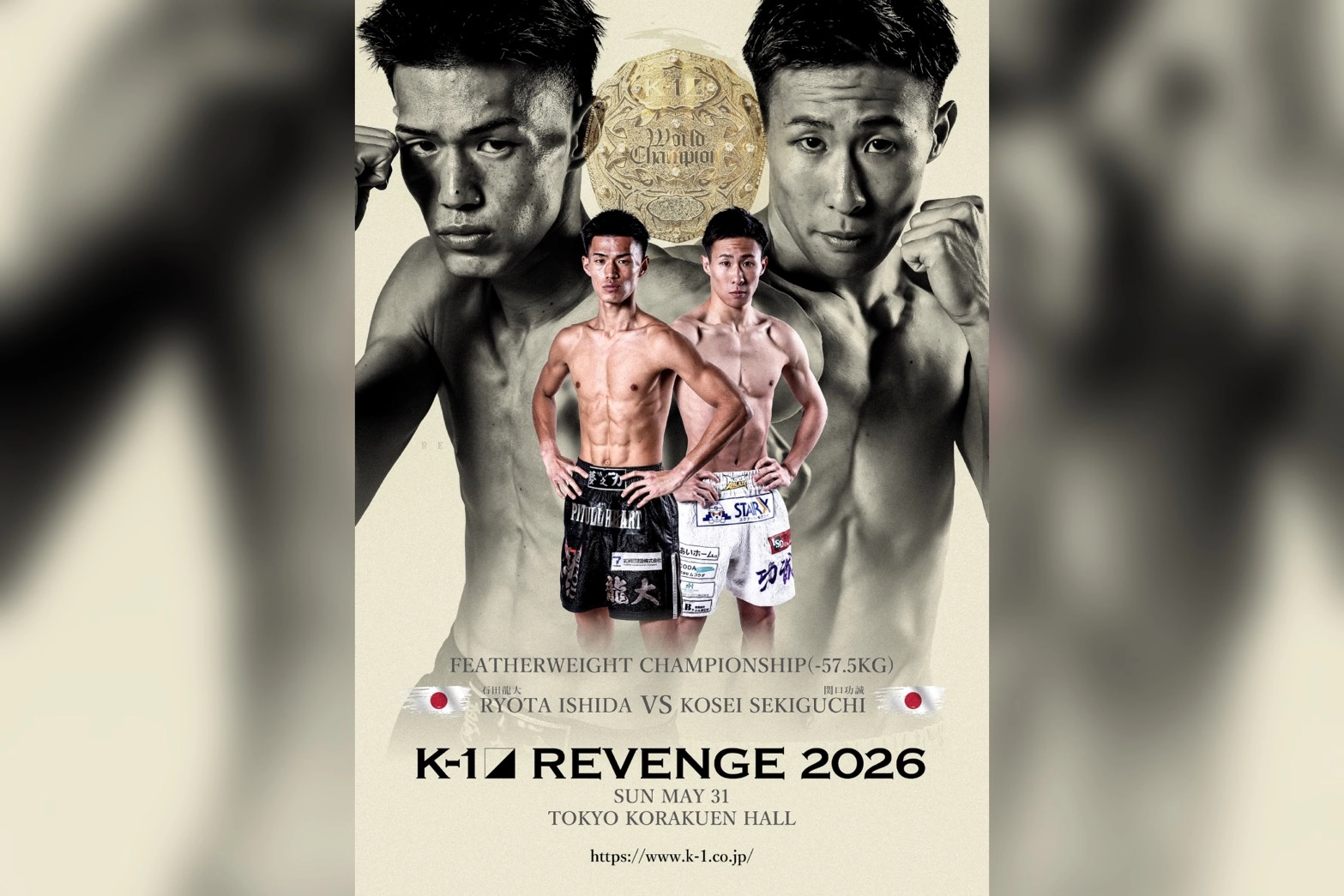 2026年5月31日(日)、東京・後楽園ホールで開催される『K-1 REVENGE』の[第7代K-1 WORLD GPフェザー級王座決定戦/3分3R・延長1R]で、石田龍大(POWER OF DREAM)と関口功誠(ALONZA ABLAZE)の対決が決まった。