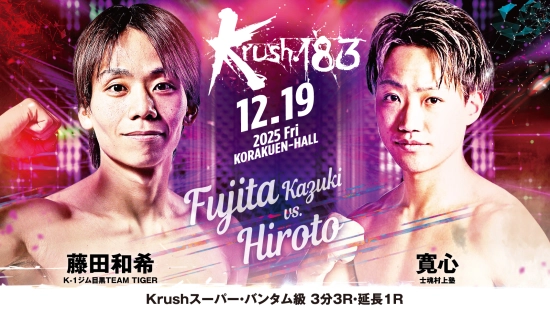 「Krush.183」12.19(金)後楽園 藤田和希vs寛心 コメント公開! 「前回からの成長をアピールしたい」(藤田)vs「何も貰わず自分だけ当てて圧倒して勝ちます!」(寛心)