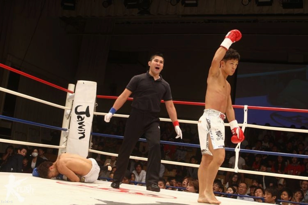 1R、どっしりと構えてローを蹴る田中。大滝は細かい前後左右のステップから、パンチで飛び込む。田中が距離を取りつつロー・ミドルを蹴るが、大滝が強烈な左ボディからの右ストレートでダウンを奪う。再開後、一気にパンチで前に出る大滝。田中も必死にパンチを打ち返すが、大滝が右ストレートを打ち抜き、鮮やかなKO勝利を収めた。