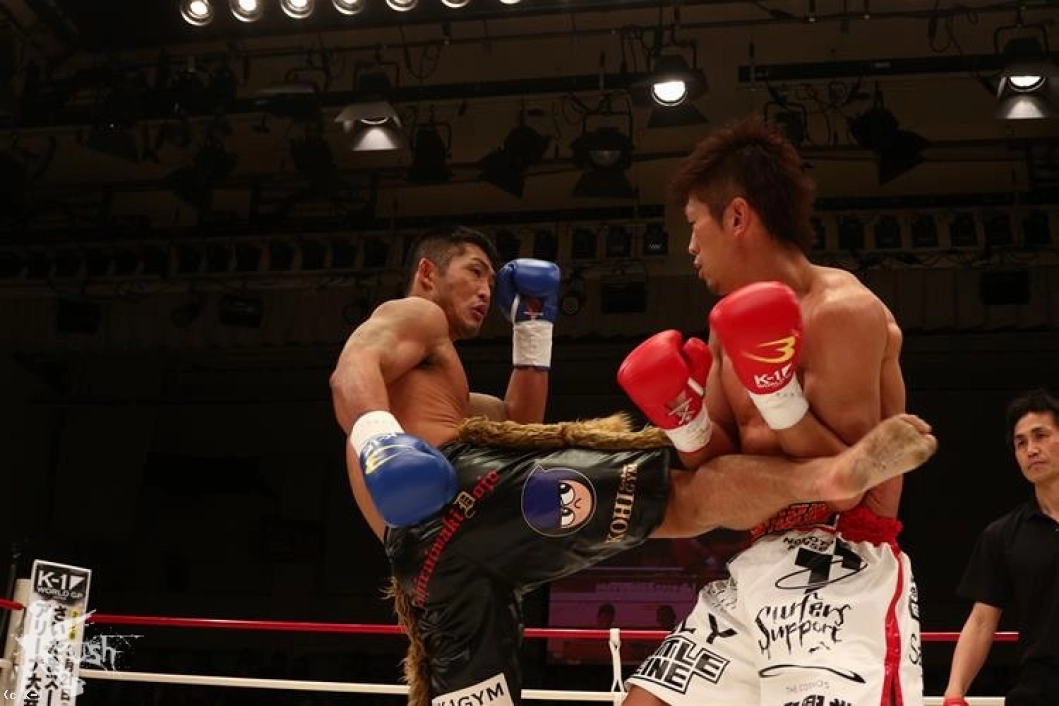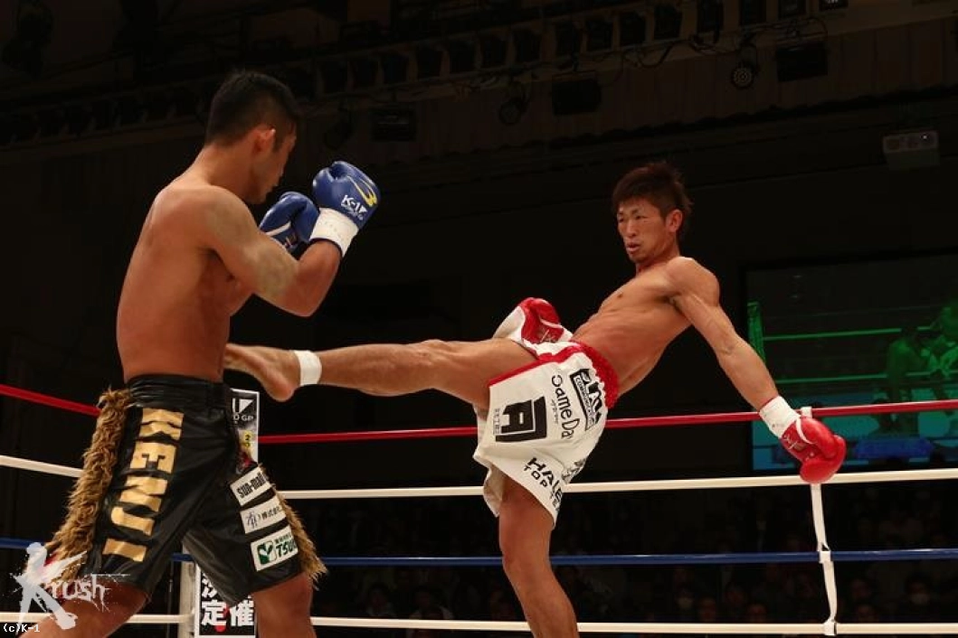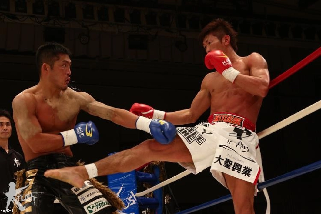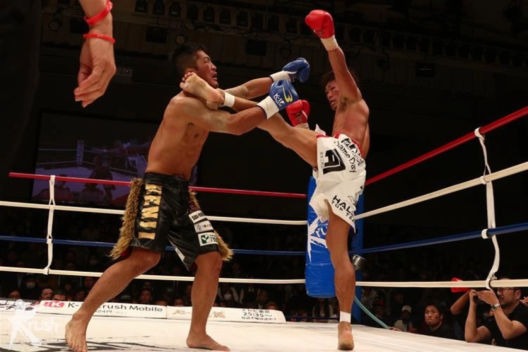 1R、オーソドックスのKENJIは右ミドルで先制するが、牧平は動じることなく得意とする左の蹴りをロー・ミドルと蹴り分けて返す。牧平はロープ際でバランスを崩して転倒したKENJIに倒れた後も攻撃を見舞ってしまい、これにKENJIは抗議する。KENJIはしかし逆にこれで火がついて前に出て、右ストレートで牧平をフラつかせる。しかし牧平も蹴り技に激しさを増し、ミドル・ヒザと見舞い、ハイキックをKENJIの側頭部に打ち込む。