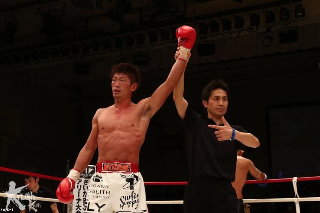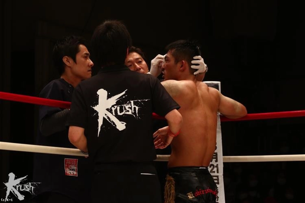 3R、KENJIは前進を強め、距離を潰して牧平の蹴りを封じに行く。牧平は左ローの連打から左ハイを顔に送り、これでKENJIは右こめかみ周辺をカットし出血する。傷は深く、ドクターがチェックを行うも続行不可能と判断しストップ。牧平が連敗脱出の勝利となった。