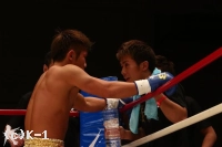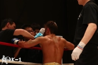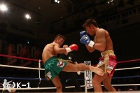 3R、中澤の右ローにややダメージを見せる小宮。中澤は跳び蹴りも見せ、さらに右ローキック。小宮がプッシングで下がらせようとしても下がらず、中澤はやはり右ローを浴びせる。やや中澤の押す場面が目立ち始めたところだったが、小宮にバッティングがあり、中澤はこれで左目周辺から出血する。再開すると前に来る小宮に対し、中澤は目に入る血をぬぐいながら応戦。やや視界が悪いか小宮が右ストレートを当てて前に出て、そこから攻める。