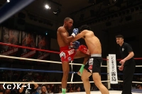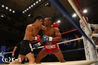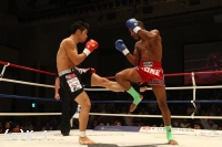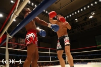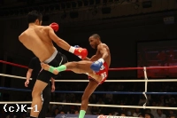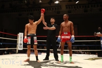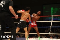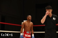 功也は圧力を発してレーヌをロープに詰める。前に出て来るレーヌだが、功也は右ハイキックを当ててフラつかせ、組みついてきても手で押してのけ反らせ、そこから右フックをヒット。さらに追撃せんと追う功也だが、ここはレーヌのジャブ&ステップに逃げられる。