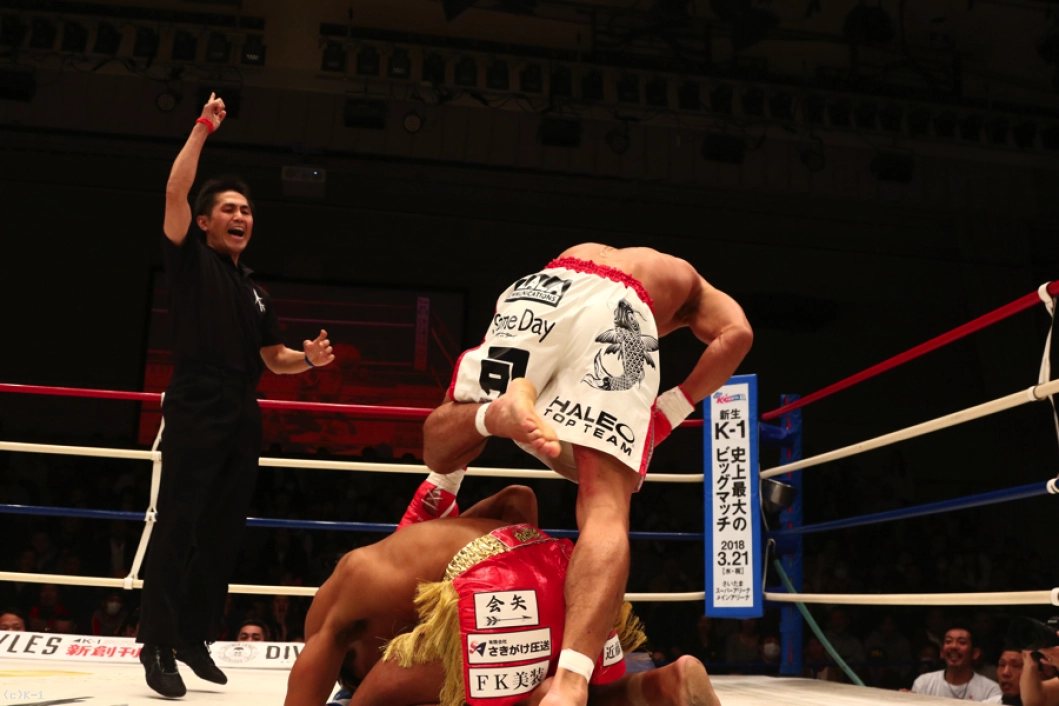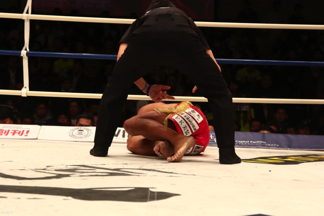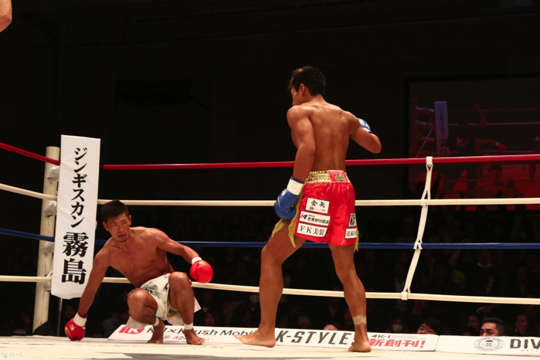 延長R、牧平は距離を保って打ち合わず、前蹴り&左ロー。平山は牧平のローをカットし右ストレートを返してヒット。蹴りを出させまいと距離を詰めていく平山だが、ここで再び牧平の蹴りがローブローとなってしまい、平山は苦悶の表情でダウン。