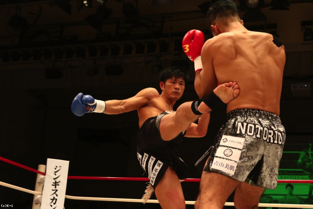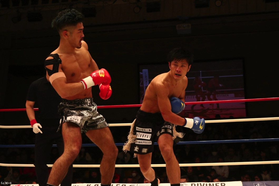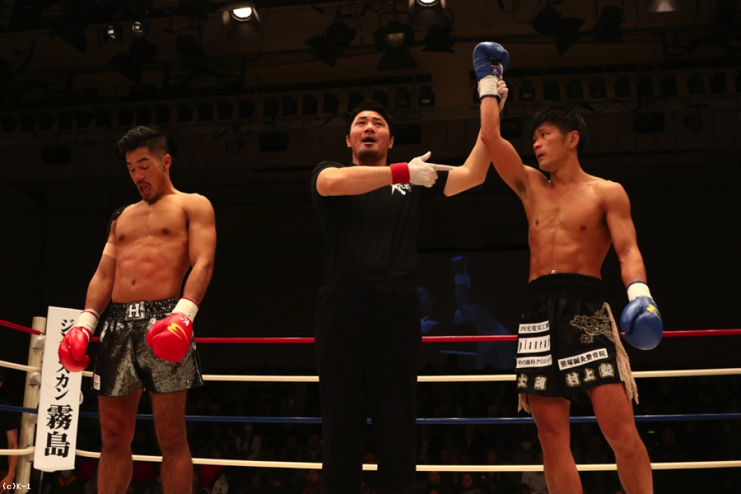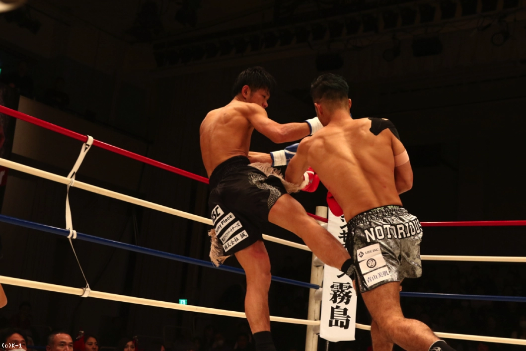 3R、距離を取る東本に水町は右ストレートを伸ばしてヒット。水町はそこから右インロー、右ミドルと攻撃を当てる。しかし東本も左ミドルで反撃。なかなか均衡が崩れない。水町が前蹴り、ヒザと前に出れば、東本も左ストレートを振るって反撃。水町は判定を意識したか、左右のフックに力を込めて終了のゴングを迎える。判定は30-29、29-29、29-28の2-0で水町。接戦を制し、51戦目を勝利で飾った。