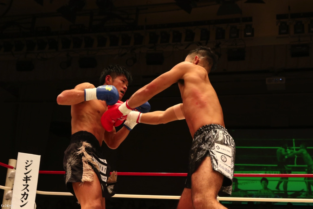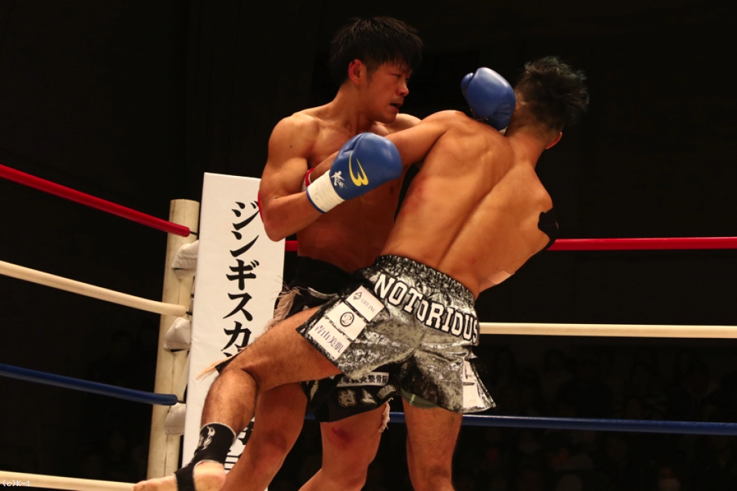 2R、水町は細かなパンチからローとミドルを繋いで前に出んとするが、東本は水町を中心にその周囲を回ってやはり距離を詰めさせない。ここで水町の蹴りがローブローとなってしまい、東本に回復の時間が与えられる。再開すると水町はガードを固めて前進を強める。しかし東本はやはり距離を開け、離れた位置から左スイングフックを振るうが当たらない。