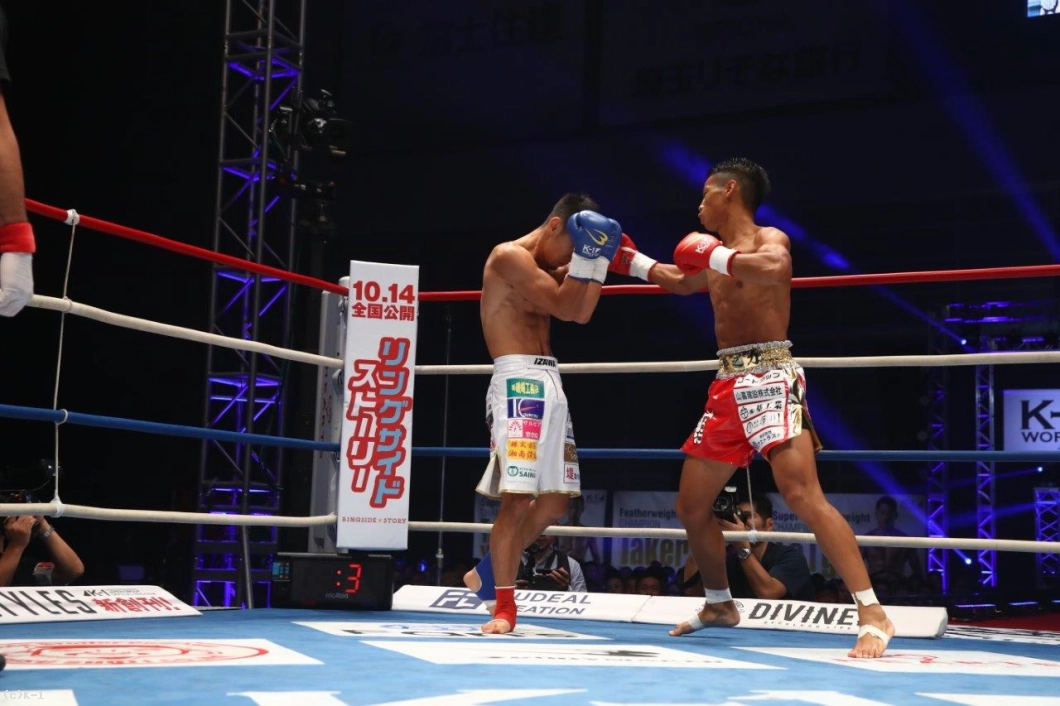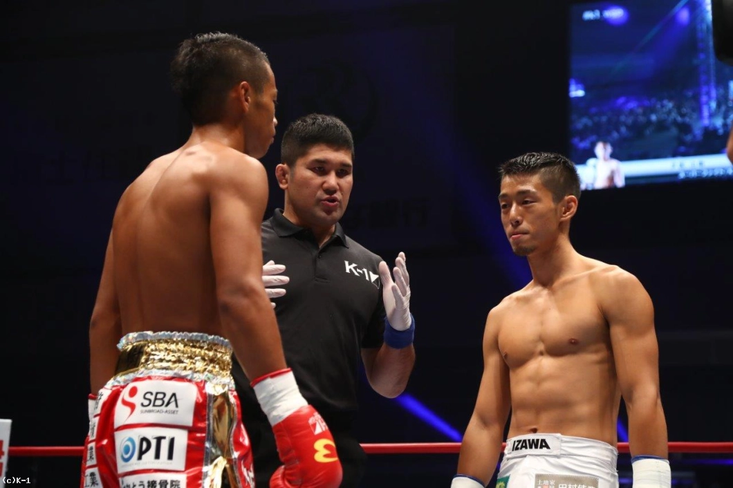 1R、伊澤は距離を取って後ろ回しの下段蹴りを送るが、武居はこれを見切って当てさせない。武居はサウスポーから左ストレート・右フックとパンチを回転させ、そこから左ミドル・左ハイを連係する。武居は足を止めず、伊澤が得意とするローを当てさせない。跳びヒザも見せて伊澤を襲うが、これは伊澤にブロックされダメージを与えられない。ブロックの固い伊澤に武居はボディストレート、顔面前蹴りと、様々な角度で攻撃を繰り出す。