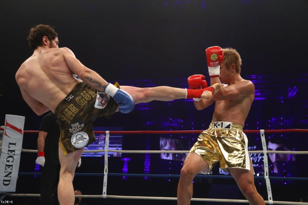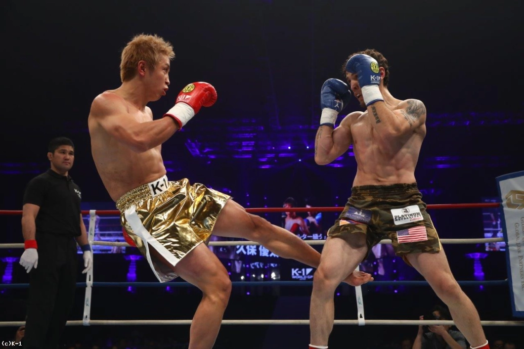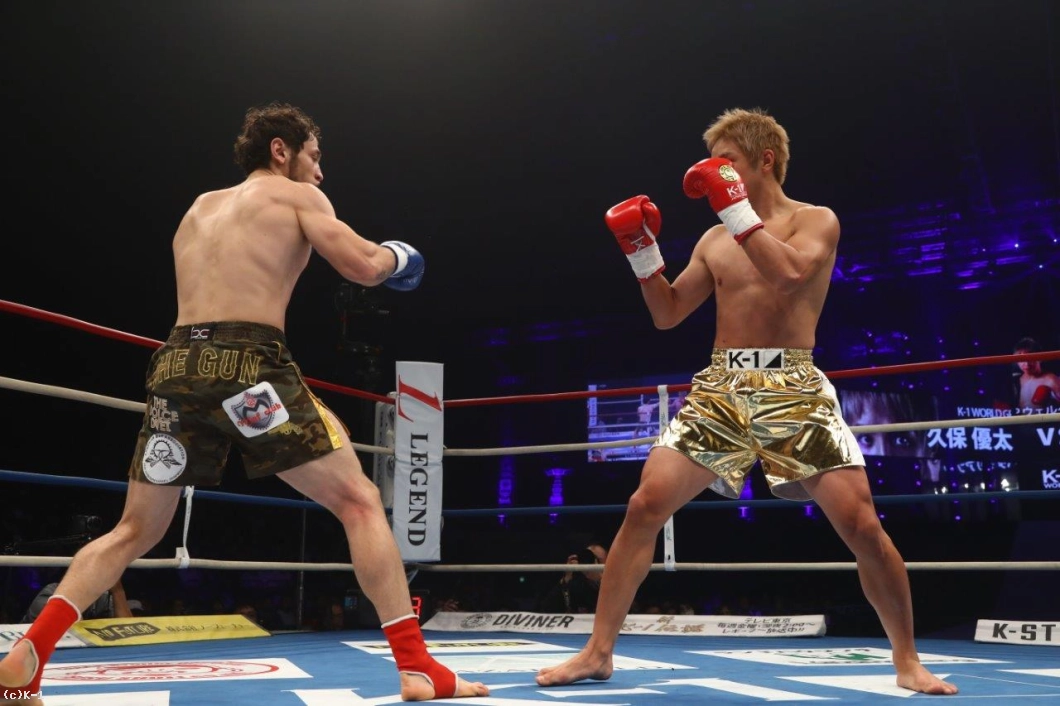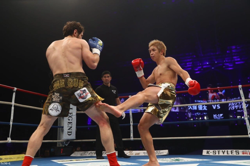 1R、ともにサウスポーで両者まずはローを蹴り合う。バダザリアンが鋭く速い左フックを振るうが、これは久保がよく見てかわしローを続行。久保はバダザリアンの進入を阻みながらローを打ち込んで行く。右足へのローを続けて浴び、やや効き始めた風のバダザリアン。久保はさらにローを蹴り溜めて初回を終える。