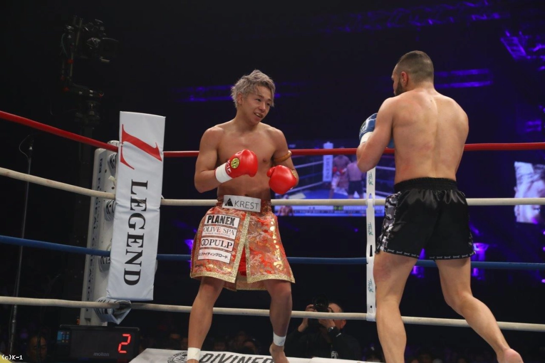 3R、前に出て一旦スタウロスをロープに詰める武尊だが、ここはスタウロスが前に出てくる。スタウロスは左フックをボディと顔面に打ち分ける。一気にラッシュを掛けたい武尊だが、スタウロスに左を当てられそれを阻まれる。武尊はしかし前蹴りから左右のボディフック。ややガードが縮こまりボディが効いている風のスタウロス。武尊も見て取り、ボディへのヒザから右ストレート、ハイキックと攻める。そして右クロスをヒット。さらに左フック、右ストレート、右スイングフック、左フックと最後は攻勢を印象付けて終える。