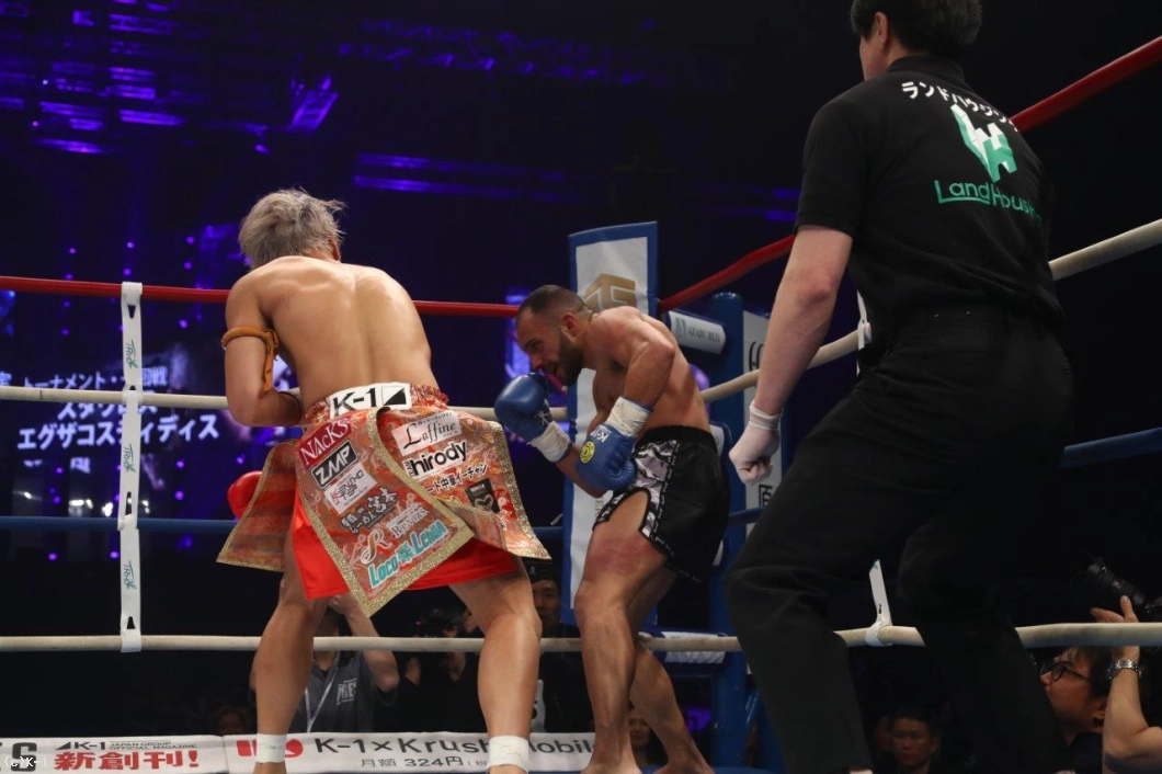 2R、武尊はやはり前蹴りを放って距離を保つ。そしてヒザで出るが、スタウロスもそこへ左フックのカウンターを狙う。武尊は前蹴りを忘れず、さらにボディへのヒザ。スタウロスも後ろ回し蹴りを繰り出してくる。そしてカウンターの左ストレートで武尊の顔をとらえ、これでやや武尊を後退させる。そこからスタウロスはジャブ、左ボディと見分けのつきにくいフォームからパンチを放ち、徐々に前へ出ていく。跳びヒザも武尊の顔面にヒット。武尊も出ていくが、スタウロスの左フックを浴びる。