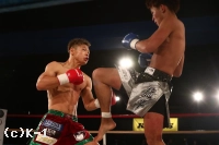 2R、小久保はやはり左右のフックから右ローにつないで攻める。龍斗も被弾する左足が気になっている様子。だが、右ミドルを強蹴して小久保を襲う。龍斗はさらに左ミドルにも力を込め、右クロス、跳びヒザと攻撃の手数とピッチを上げる。