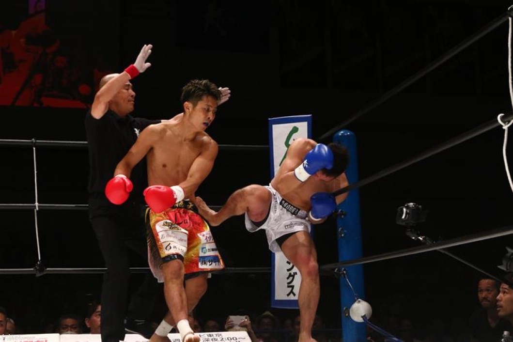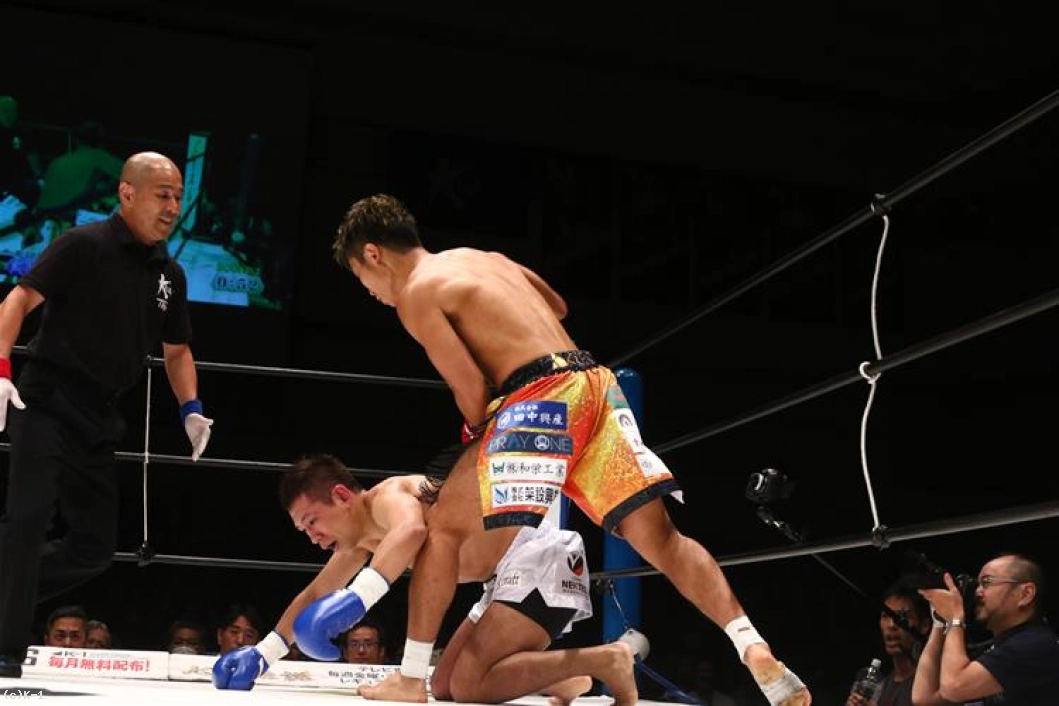 2R、大岩は跳びヒザから着地するとすぐにフックを振るって襲い掛かる。ここはブロッキングでクリーンヒットを許さない山本だが、攻めて出る隙が見い出せない。ストレート、フックと大岩のボディに送り、そこから攻めんとする山本だが、ローのダメージでパンチにウェイトが乗っていない印象。逆に大岩は確実にローを効かせ、その後プッシングして右のパンチで襲い掛かると山本は力なく倒れダウンを喫してしまう。続いて大岩は右ストレートで2度目のダウンを奪い、そして連打をまとめて山本から3度目の奪ってKO勝利を決めた。