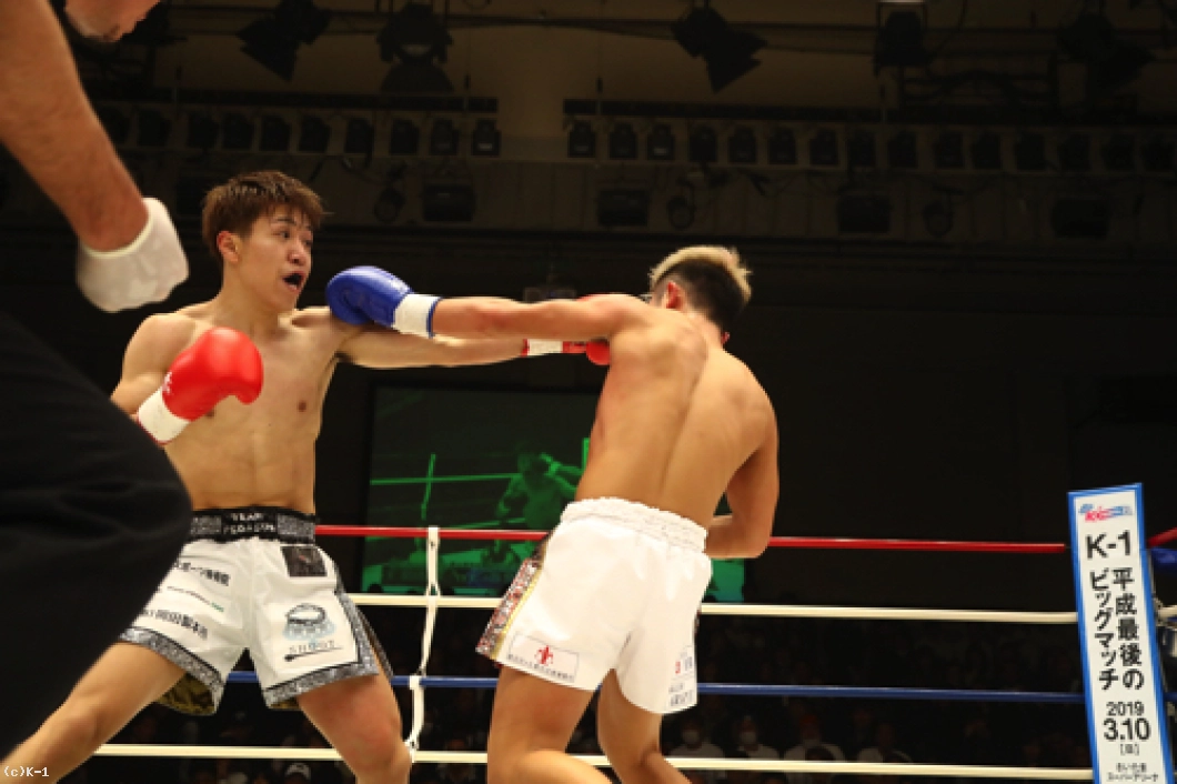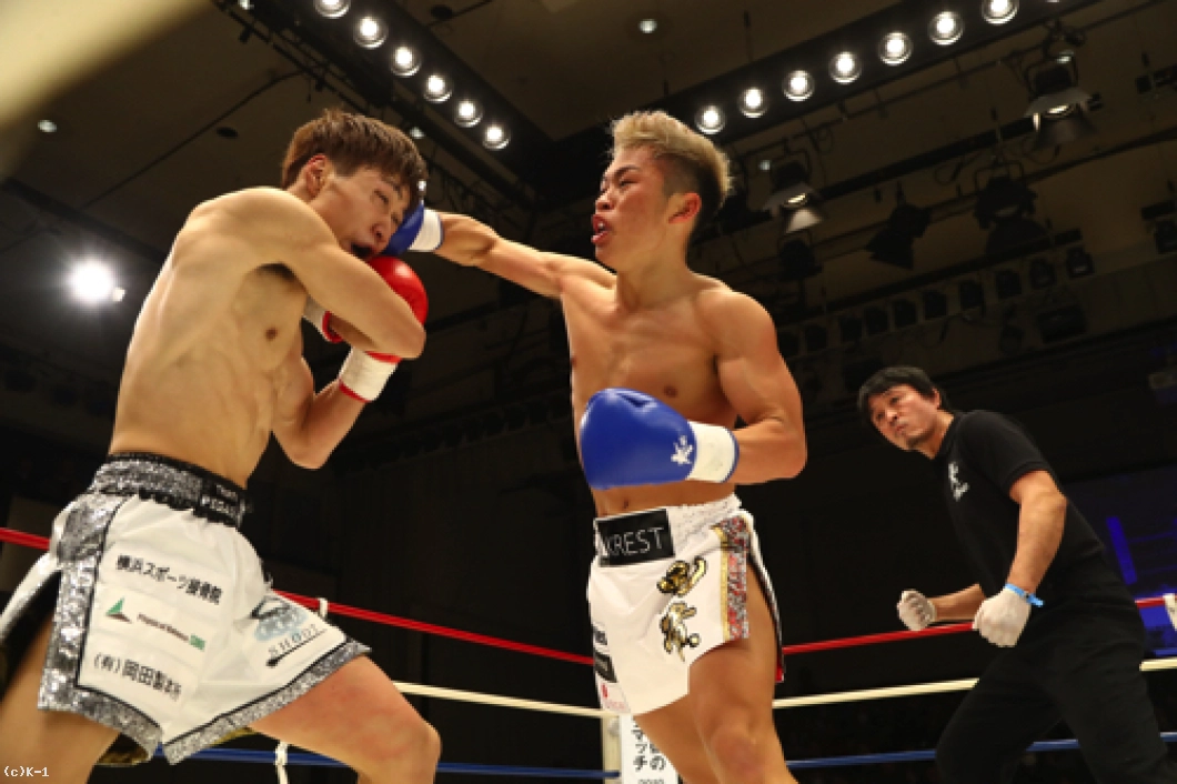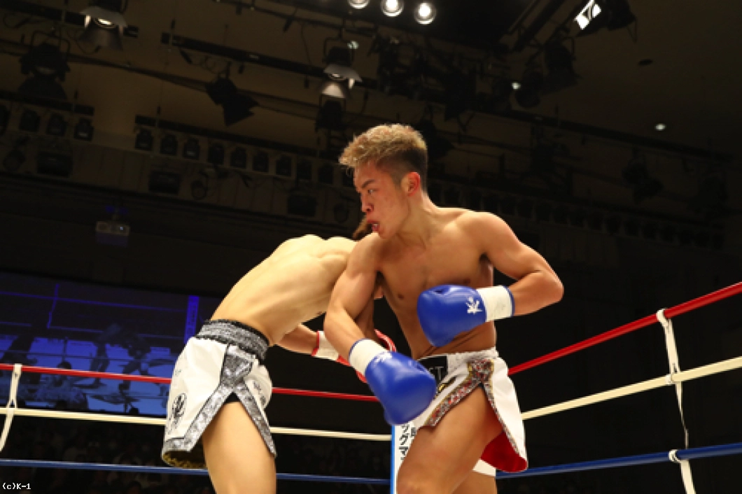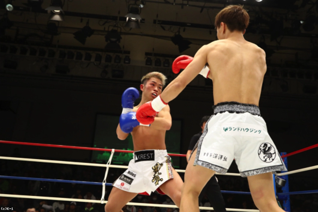 延長R、晃貴は接近戦で馬力を発揮して萩原を押す。これに倒し萩原は距離が開くとハイキックを飛ばす。蹴りのあとで足がフラつく萩原だが、前に出て右ストレートを当てる。圧力のある晃貴を受け止め、押して下がらせる萩原。だが晃貴は接近際に右ストレートを当てる。右ハイ、バックブローを放つ萩原だが当たらない。攻撃に蹴りを織り交ぜる萩原に対し、晃貴はやはりパンチ主体で戦い終了のゴングとなる。判定は3者10-9で晃貴。武尊の後を追い、Krush王者の夢を成し遂げた。