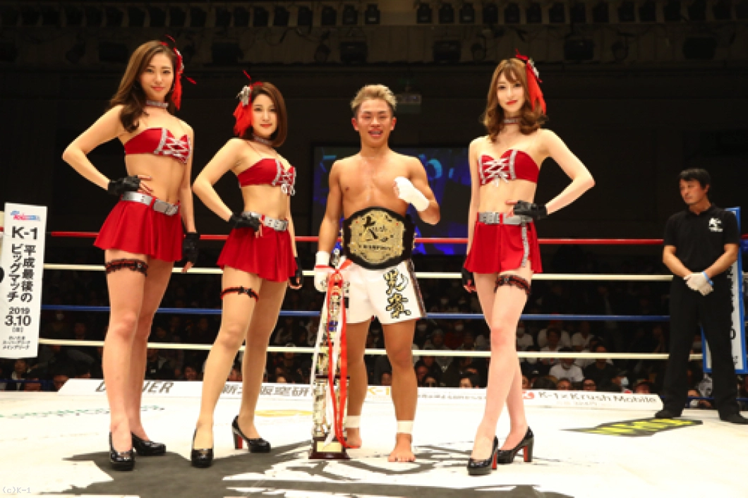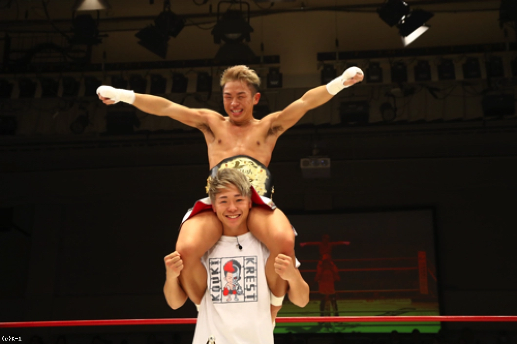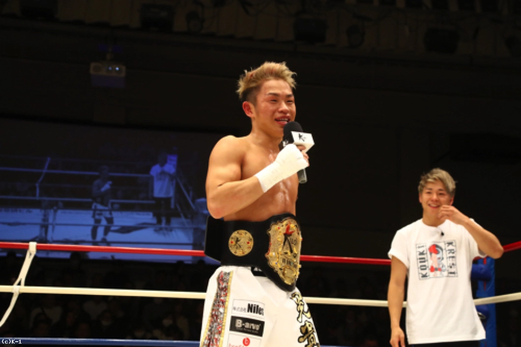 「今日はたくさんの応援ありがとうございます。自分1人の力じゃ獲れない、ジムの代表や仲間に鍛えてもらって獲れたベルトです。本当にありがとうございます。……何言えばいいか分からないですね(笑)。僕はまだ一度もK-1に出たことがないので、6月両国のK-1に出させてください。お願いします。たくさんの応援ありがとうございます。押忍。喋るのが得意じゃないんでこの辺で失礼します。Krushのチャンピオンになって武尊くんに肩車してもらって写真撮るの夢だったんでいいですか?(※このあと武尊に肩車されて記念撮影を行った)」