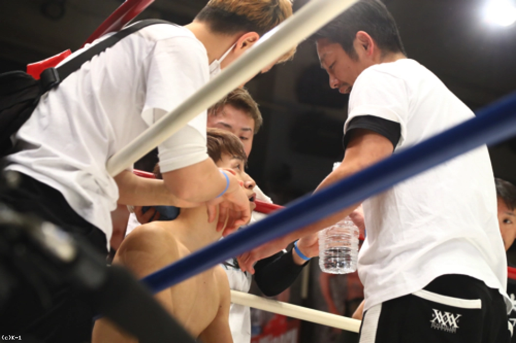 「(試合を振り返って?)技術云々もそうなんですけど、気持ちのほうで負けたっていうのが悔しいです。延長を取られたのは、気持ちで負けたということなので。僕も人生かけてましたけど、晃貴選手もかけていて。僕のほうに優しい部分が見えてしまい、そこは(梶原)龍児さんに指導していただきました。(対戦前と相手の印象に変化は?)とくに変わらないですね。(今後の目標は?)自分は今回タイトルマッチで負けてしまったんですけど、いまはタイトルを取るときじゃないんだなって思います。もっと揉んでもらって、僕自身ももっととんがっていかないと、Krushのベルトは巡ってこないんじゃないかと思います。次のチャンスをもらえるまで、僕も死ぬ気でやっていきます」