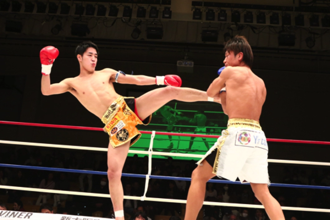 2R、MMA出身の蓮實は体の強さを活かし前に出て瓦田に圧力を掛ける。接近して左右のフックを強振する蓮實に、瓦田は逆に顔へのヒザ、離れた間合いではボディに前蹴りを突き刺す。しかし蓮實はお構いなしとばかり前に出る。瓦田はボディへのヒザから顔に連打をまとめるが、蓮實はそこから逆に打ち返す。右アッパーも突き上げる蓮實だが、瓦田はダメージを見せず、打ち下ろしの右ストレートを決め蓮實をダウンさせる。