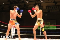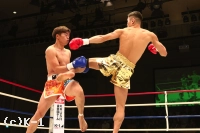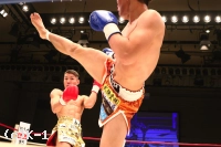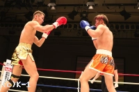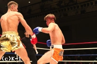 2R、左ミドルから出て行かんとする山田に、勝輝は右ハイキック。山田は再び左ミドルから前に出ていく。勝輝もジャブ・ストレートで前に出ていこうとするのだが、山田は距離を取る。カウンターの左ストレート、右フックを合わせ勝輝の前進をストップする山田。ジャブ・ストレートで勝輝を後退させ、ハイキックで勝輝を脅かす。