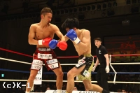 2R、島野は開始から前に出て気持ちを見せるが、西京の左フックがとらえる。だが島野のパンチが左フック・右ストレートと1Rより当たり始める。西京は被弾があってもペースを崩さず、右ストレート、アッパーを当てる。西京はジャブとストレートを駆使し、島野が間合いを詰めてきても接近を許さない。西京はジャブあるいはストレートを当てた後でヒラリと島野とのポジションを入れ替える。