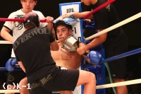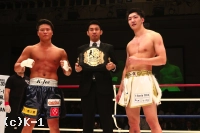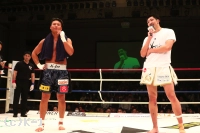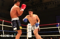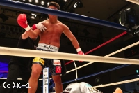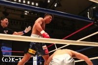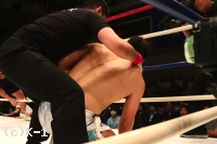 2R、やはりこのラウンドも杉本はロープを背負う。カウンターのパンチを狙っているか。K-Jeeは圧力を掛け、杉本をロープ際から出させない。そして打ち合いを仕掛けると、杉本の右ストレートに合わせて右フック。これがズバリと決まって杉本は前のめりにダウンし、K-Jeeが決勝進出を決めた。試合後、決勝でクルーザー級王座を争うK-JeeとRUIがリングに上がって挨拶を行った。