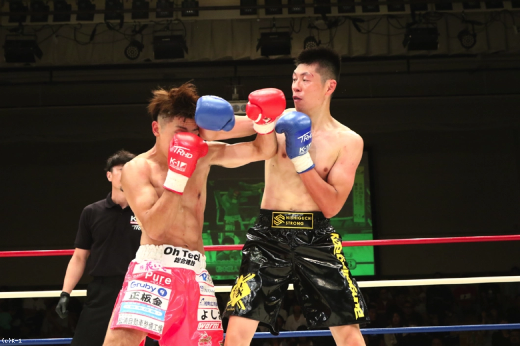 3R、ミドルの数を増やす山際。これがわき腹をとらえ、松本はやや圧力が落ちる。山際は前蹴り、左右ミドル、そして左右のフックとヒットが増える。前に出て距離を潰しに行く松本だが、これまでのラウンドより山際に距離を作られ蹴りを浴びてしまう。間合いを詰めヒザとストレートを放つ松本を山際はプッシングして下がらせる。だが、松本の圧力も効いており山際は鼻血と苦しそうな表情を見せ、組みつきも注意を受ける。判定は30-30、29-29、29-29でドロー。延長戦に突入となる。
