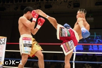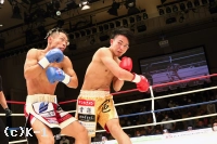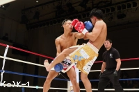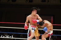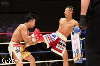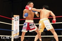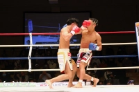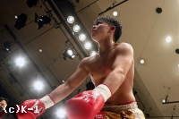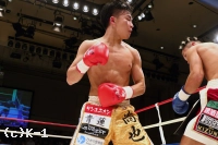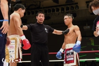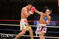 2R、前に来る小倉を吏羅は左ストレートを強振して止めんとするが、小倉はこのパンチに下がらない。逆に小倉は左フックを打ち込んで前に出る。吏羅は頻繁に構えをスイッチし、左右ストレートでとらえるが、吏羅がロープを背にしたところで小倉が右ストレートを当てダウンを奪う。