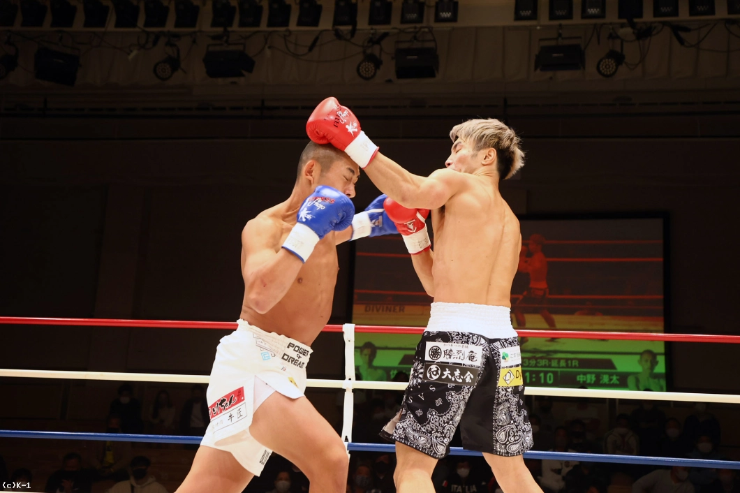 1R、佐々木は右ローを当て、中野のミドルをかわして様子見する。中野はパンチの交錯する場面で右ストレート、左フックと当て佐々木をヒヤリとさせる。中野はさらにジャブのリードから右クロスを連係。佐々木はこれにミドルを返す。