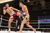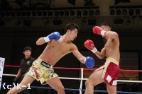 2R、伊藤はジャブを突き左ミドルを入れながら左回り。これで自分の間合いを作り安達を懐に入れない。安達はしかし左フック、右ストレートと放って迫る。伊藤はプッシングで間合いを戻すが、安達はパンチで意識を上に散らしてから右ローを当てる。