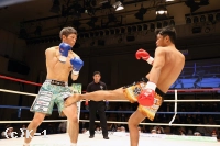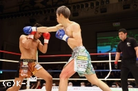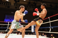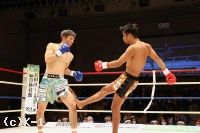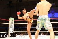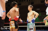 2R、大沢はやはり距離を取って構え、そこから右ロー、踏み込んでの左ボディフックと入れる。そしてサウスポーに変わった大沢はローキックを放つが、これが再びローブローとなってしまい、川﨑のダメージ回復に時間が取られる。大沢には警告が与えられる。大沢は再び距離を開け、横蹴りやミドルで川﨑を懐に入らせない。