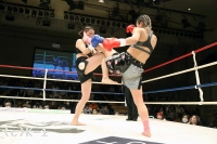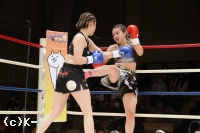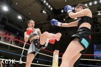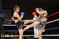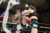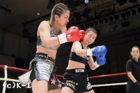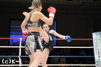 2R、真優は同門の椿原龍矢のように自ら下がって距離を作りカウンターを狙う。そして壽美に顔面前蹴り。両者距離が近づき組み合いが多くなる。得意の前蹴りを飛ばす真優だが、クリンチが増えてしまい、レフェリーから組みつきの警告を受ける。壽美はノーモーションの左ストレートを当て、真優はミドルと前蹴りで応戦する。