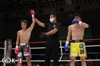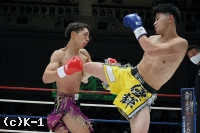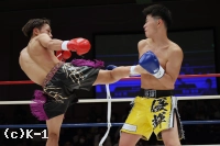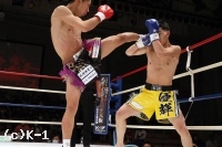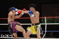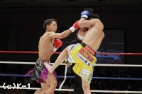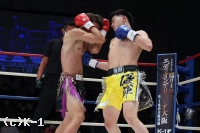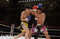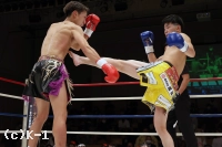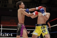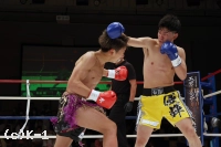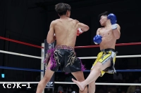 1R、両者ともにサウスポーで、豊田の蹴りに松谷はスピードと重みのある蹴りを返していく。豊田は右フック、左ストレートを当てるが、これは松谷が浅い当たりにとどめる。松谷は左ボディストレートから返した右フックをヒット。さらに豊田に後ろ回し蹴りを放つ。同じ技を呼応して技を返す豊田。