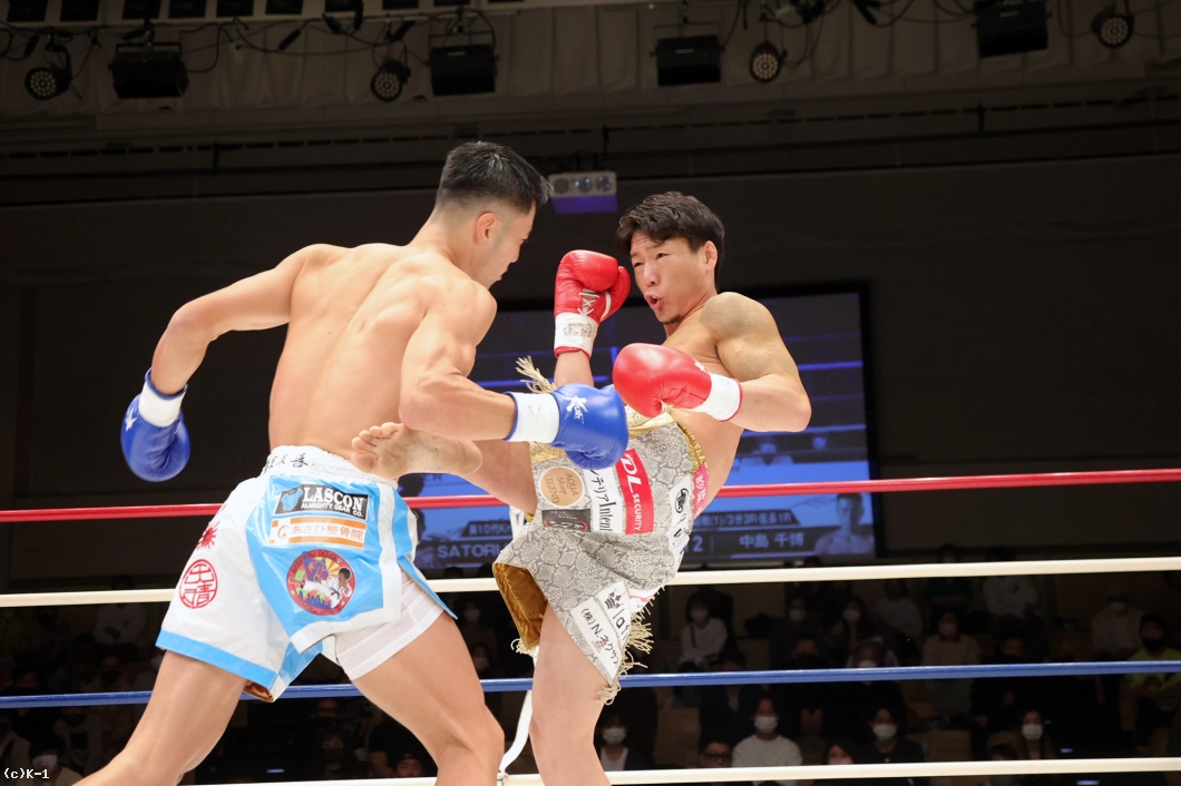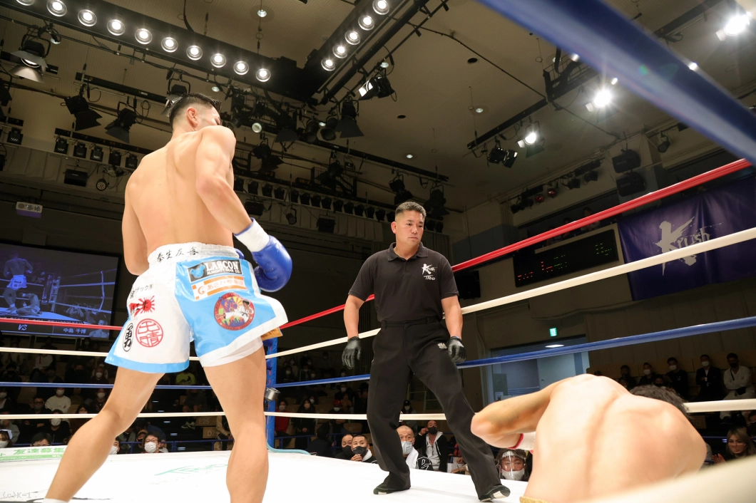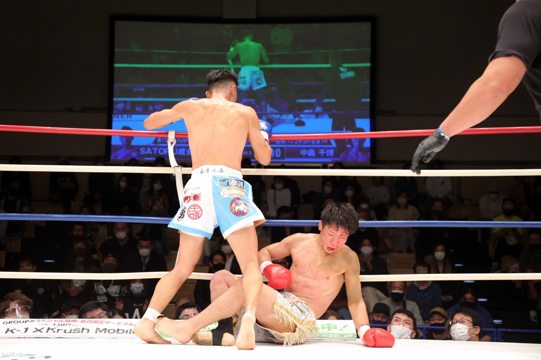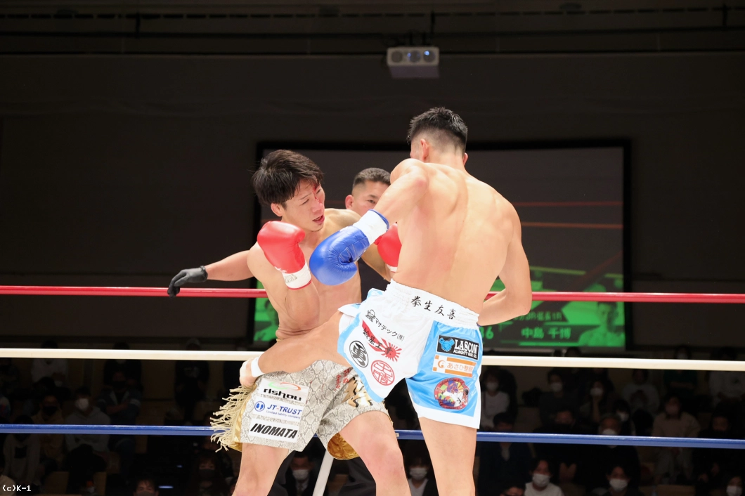 3R、成合の左ローがローブローとなってしまい試合は一時中断。再開すると中島は成合のパンチをブロックで弾き、右アッパーから左フックと繋ぎ、最後は左ショートストレートでダウンを奪う。ここでレフェリーが試合をストップし、中島が準決勝に勝ち上がった。