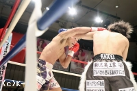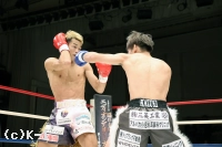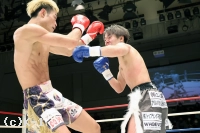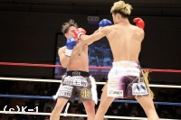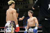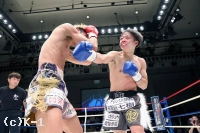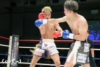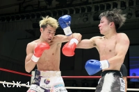 1R、170㎝の池田がいきなりの右ハイ。藤田は池田のハイをスウェーでかわしながら左ジャブで距離を詰める。池田は長いリーチから左ジャブ、右ロー。藤田の前進に左フックを引っかけサイドに回る。テンポ良く距離の長いジャブ、右ミドルを繰り出す池田に、藤田は高いガードから左ミドル、ワンツーで前進。踏み込み右のオーバーハンドフック、左ボディで池田を攻める。