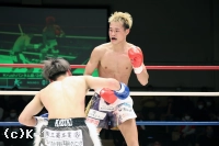 「綺麗にKO勝ちすることを狙ったんですけど、ドロドロの試合になっちゃって。盛り上げることはできたんですが、思い通りの試合にはならなくて、それは改善点だと思います。(対戦相手の印象は?)もともと打ち合いが強いと思ったんですけど、その通りパンチが硬くて重くて根性もあって、すごくいい選手でした。(今後の目標は?)もう自分はトップ戦線にいると思うので、同じトップ選手たちに勝って、さらに上を目指したいと思います」