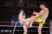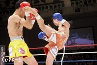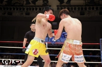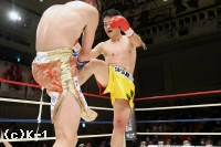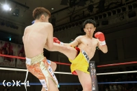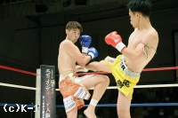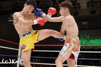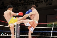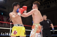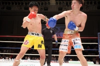 2R、竜樹が重い右ミドルでプレッシャー。迅也が左ローを返すと、竜樹の足がやや流れる。竜樹の入り際に迅也は右バックハンドブロー。右ジャブから左のオーバーハンドフック、スイッチして右バックスピンキックと迅也が変則的な攻撃でプレッシャーをかける。竜樹はガードを高く固め右ミドル。左のミドルも見せる竜樹へ、迅也は懐に呼び込んで強い右フックをガードの上に叩き込む。