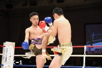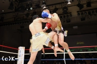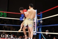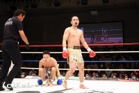 立ち上がるも目に力のない篠塚。新美は再びボディにヒザを入れ2度目のダウンを奪う。残り時間は少なかったが、新美は右フックを打ち込み、篠塚が倒れていくところにヒザ蹴りをダメ押しで入れて、篠塚をKOして3度目の防衛に成功した。