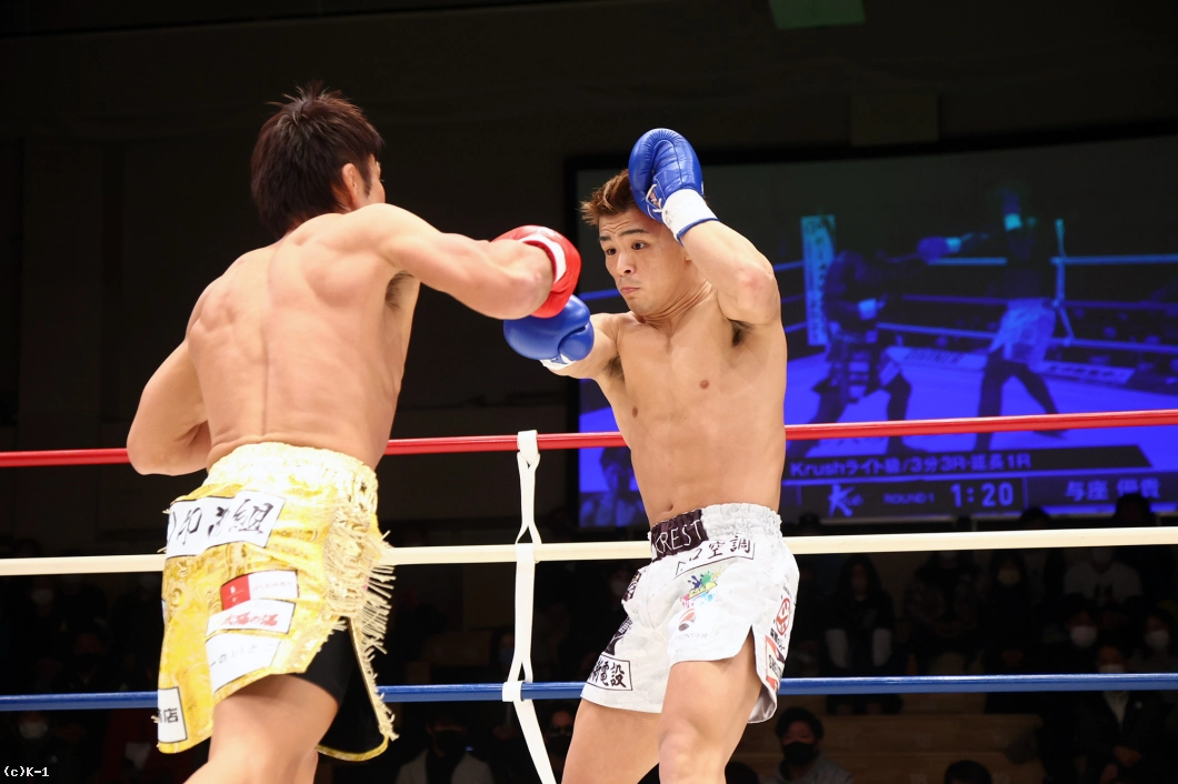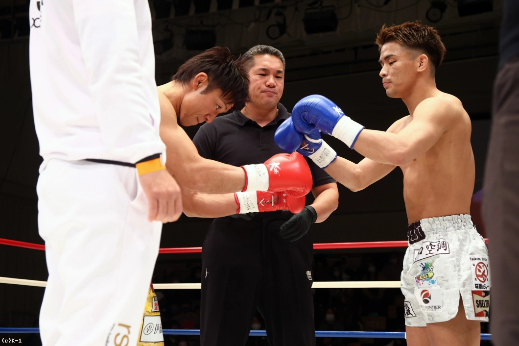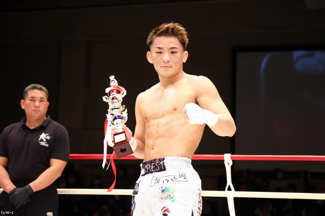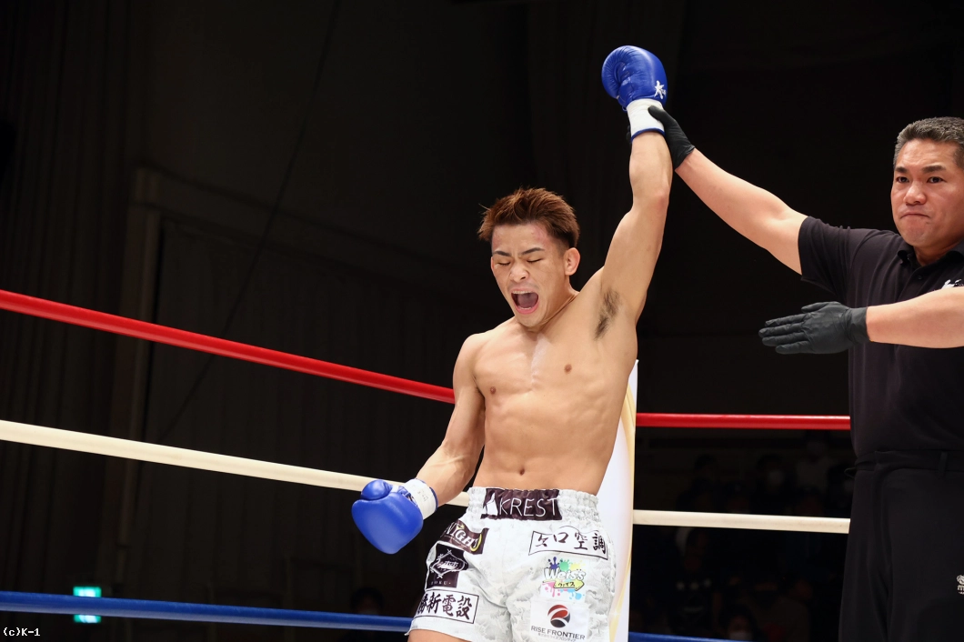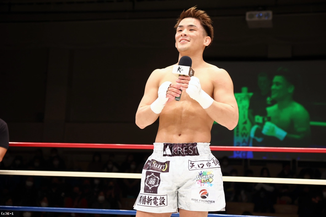 「Krush初参戦だったんで倒し方にこだわっていました。結果的にKOで勝ててよかったんですけど、1Rはかたくなっちゃたんで。そこは次に向けて改善したいと思います。(対戦相手の印象は?)自分の蹴りを対策しているのが伝わって、細かいフェイントに反応してくれなくてやりづらかったです。ただパンチはブロックできていて大丈夫だなと思いました。(今後は)K-1チャンピオンになるためにK-1 JAPAN GROUPに来たんで、強豪を一人一人倒して必ずベルトを巻きます」