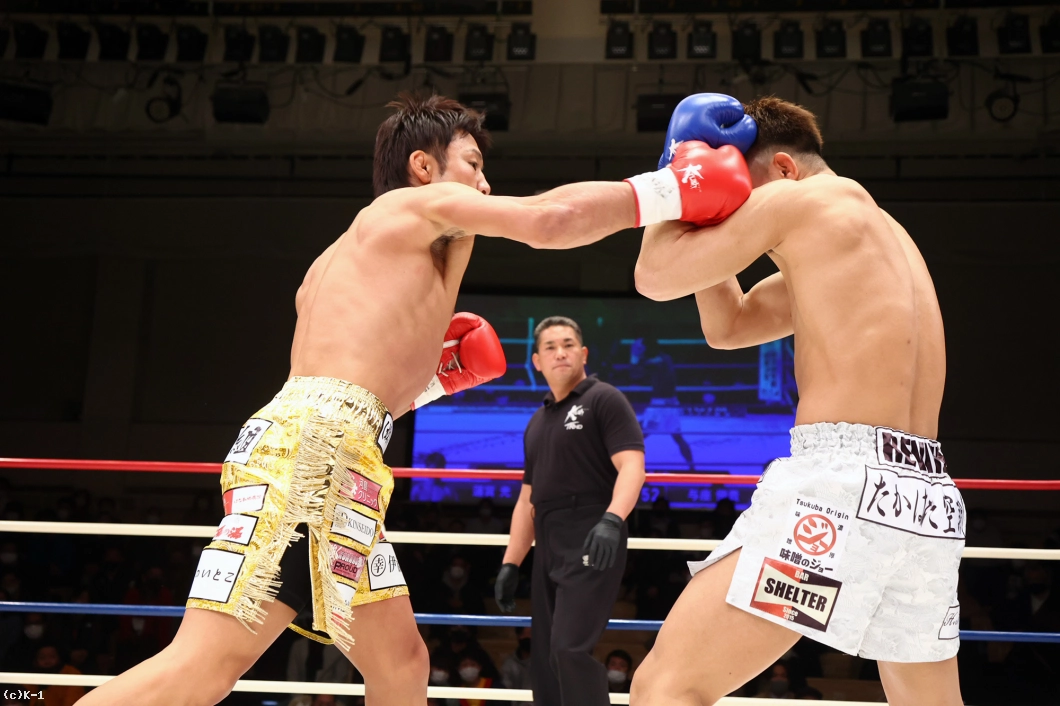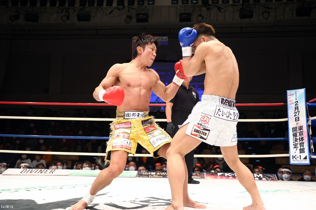 「K-1・Krushファンのみなさん、はじめまして。自分はK-1でチャンピオンになるためにK-1 JAPAN GROUPに来ました。ライト級は強い選手が多いですが、1人1人倒して行って必ずチャンピオンになりたいと思います。中村プロデューサー、自分が極真で世界一になった場所が東京体育館なので、ぜひ2月のK-1東京体育館大会に出場させてください」