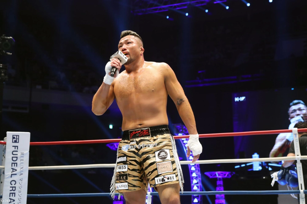 「K-1ファイターになりましたANIMAL☆KOJIです。難病で入院してるALIVEのユウくん、俺も頑張ったからお前も頑張れよ。中村プロデューサー、タイトルマッチお願いします。今日はもらい過ぎてこれぐらいしか話しません」
