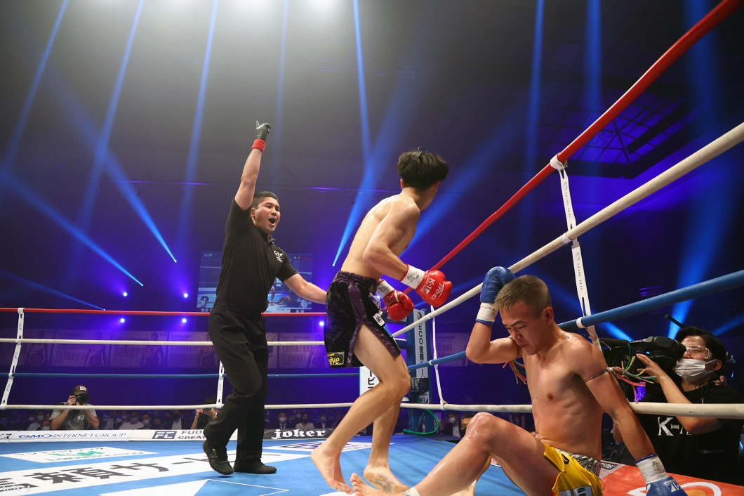 3R、西京はミドル、ロー。竜樹も同じ技を返す。竜樹はガードを上げてにじりよって攻めんとするが、西京はボディ打ち、右クロスと決めていく。竜樹が圧を掛けてくると、西京は周囲を回ってジャブと飛びヒザ、連打といなし、終了間際に前へ来た竜樹に右ショートフックを当ててダウンを奪い終了した。判定は30-27、30-26、30-27の3-0で西京。ライト級転向後、2連勝となった。