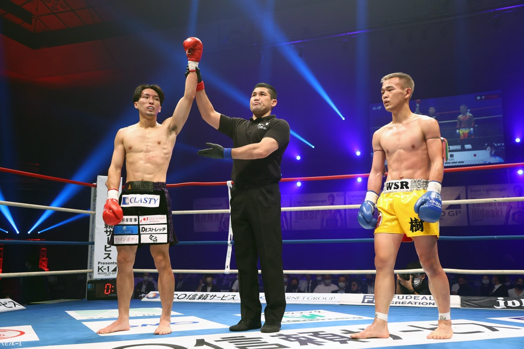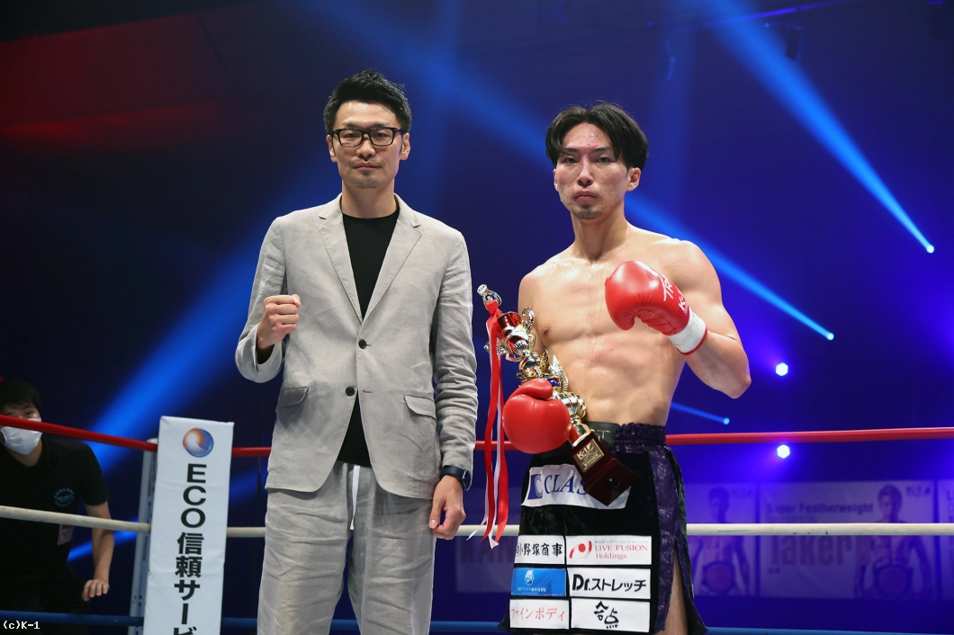 「(試合の感想は?)試合内容的には全然納得できてなくて、最後ダウンは取ったんですけど、課題の残る試合でした。(相手の印象は?)何発か顔も腹もいいの入ったと思うんですけど、全然効いた素振りがなくてタフだなっていうのと、一発一発の攻撃が思った以上に固かったですね。(ダウンを取るまでは攻めどころを探っていた?)上と下と脚に散らすというのを課題にしてて、(ダウンを取った)あのパンチも狙ったパンチじゃないんで、マグレなのかなって感じですね。(この先の目標は?)この試合内容じゃタイトル戦線にはほど遠いんで、1戦1戦、納得いくような試合をしていくのがこれからの目標ですね。(ファンの方へメッセージを)今後も1戦1戦、自分もお客さんも納得できるような試合をしていきたいと思ってますので、まだまだご注目よろしくお願いします」